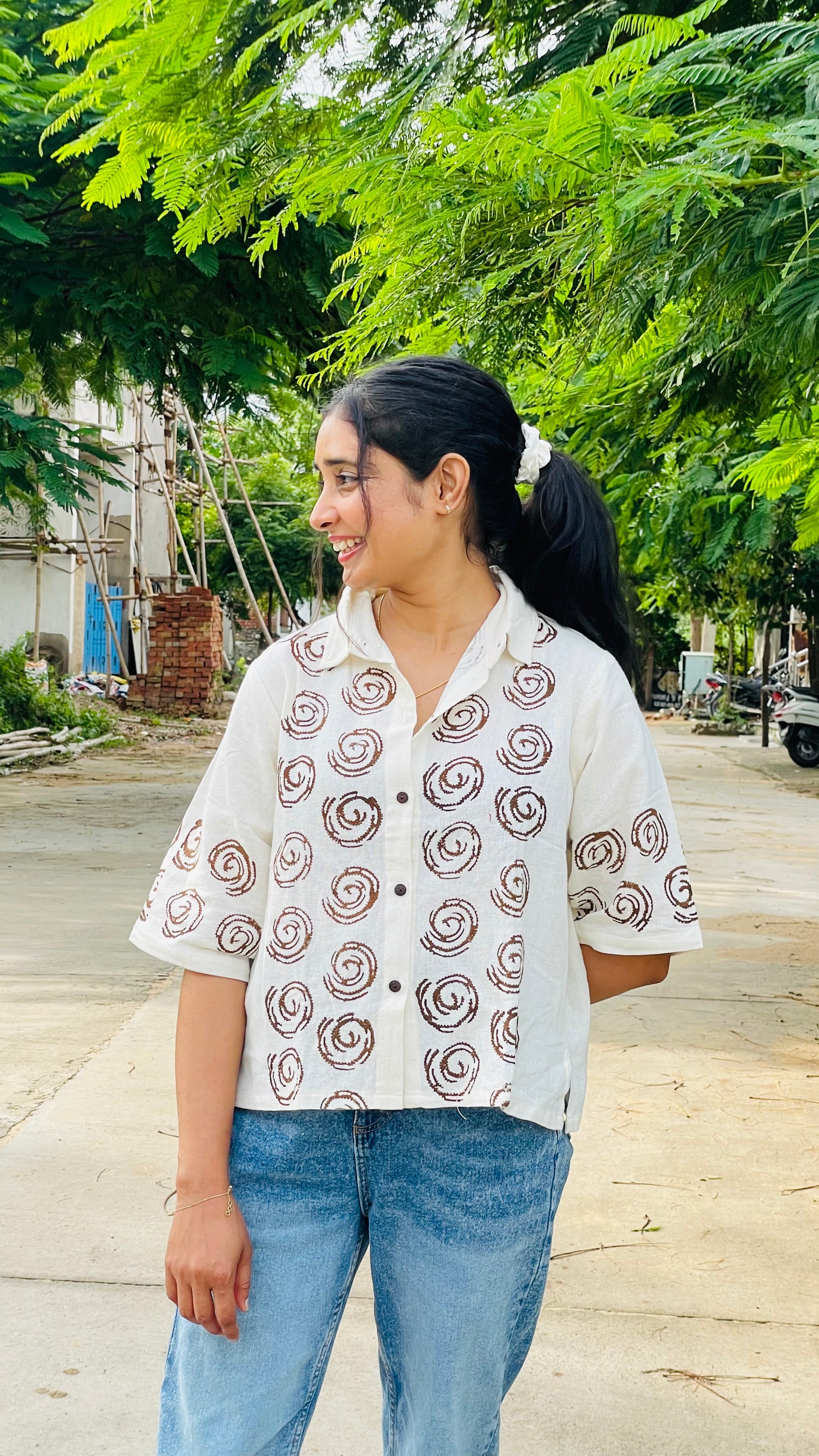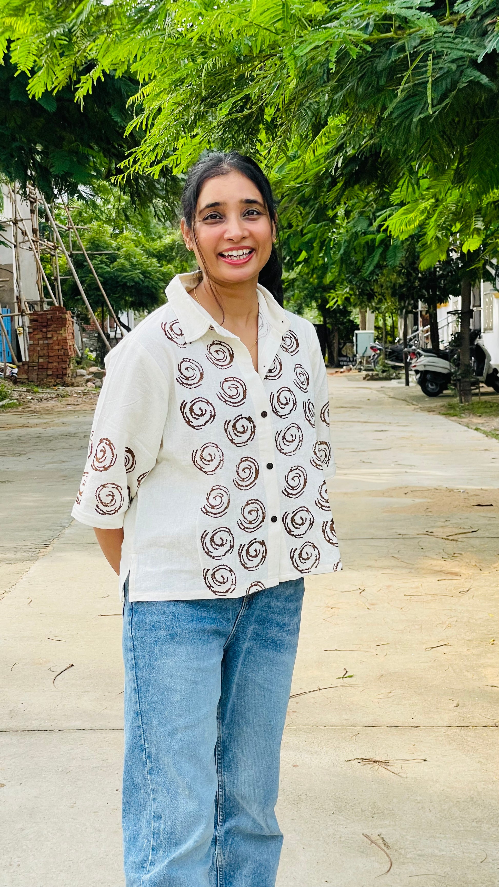 This off-white jute-cotton shirt is all about comfort with a touch of craft. The fabric feels light and breathable, perfect for long hours of wear. The earthy brown circular block prints along the front and sleeves give it a handcrafted, festive charm without being too loud.