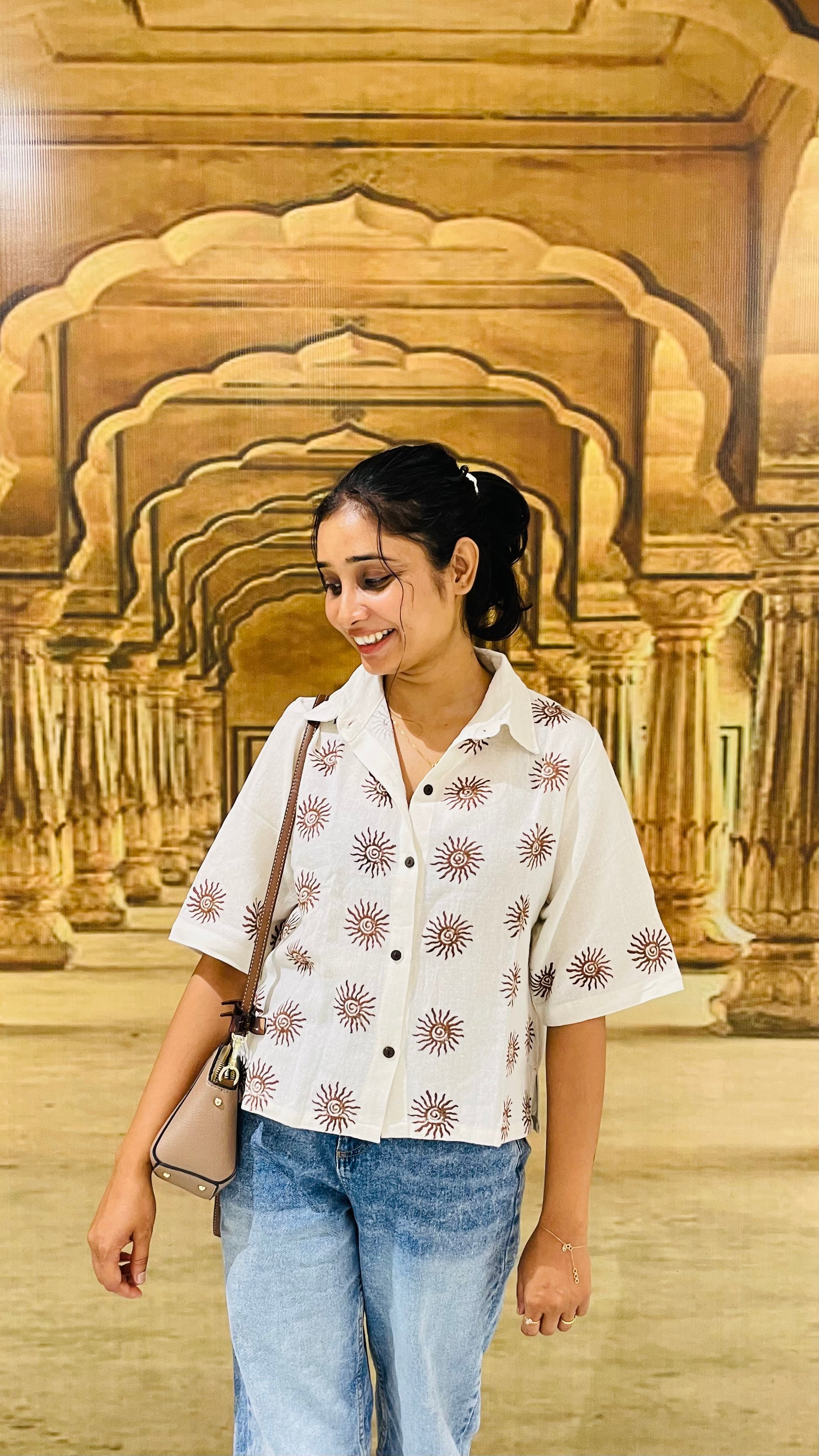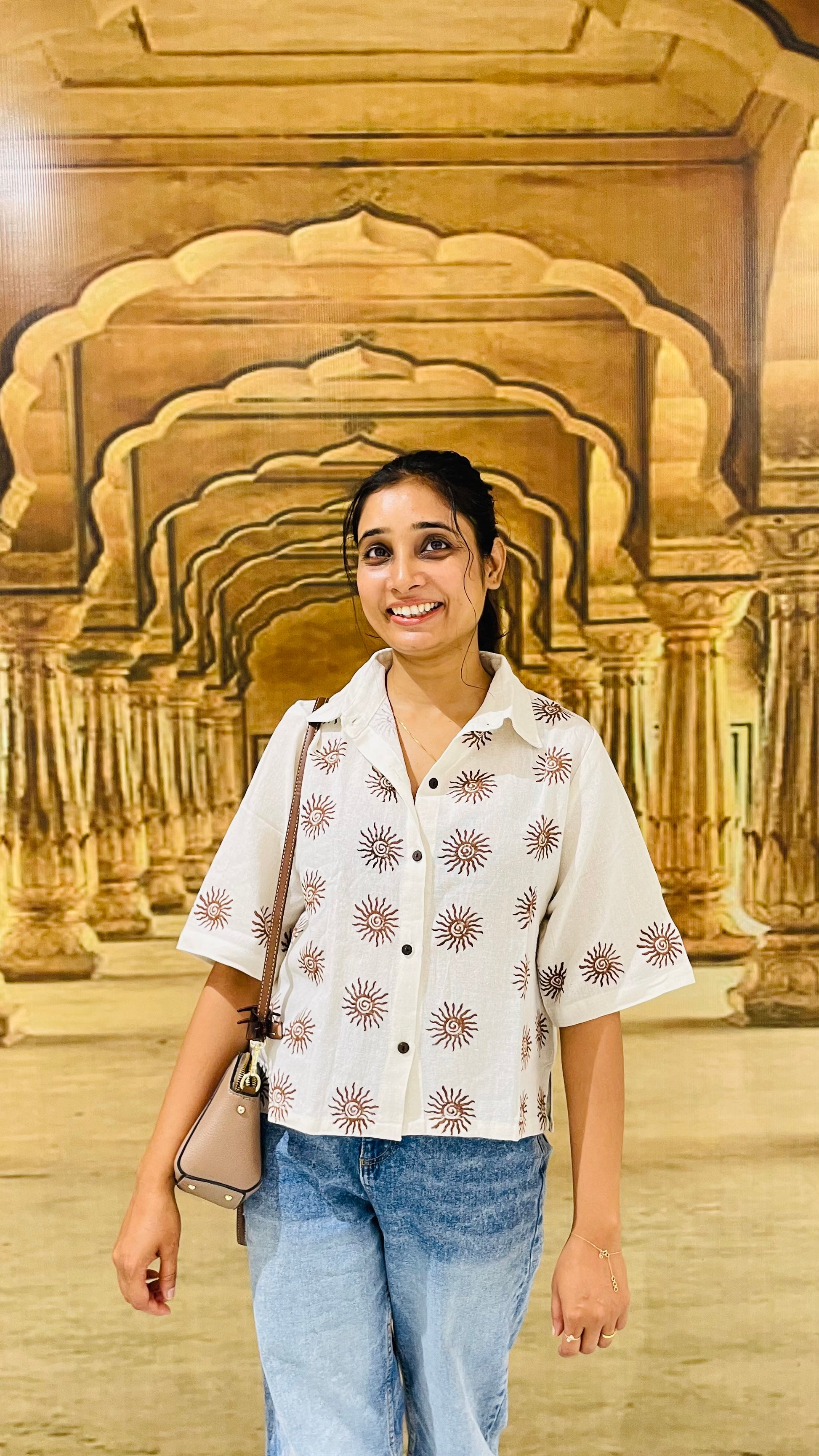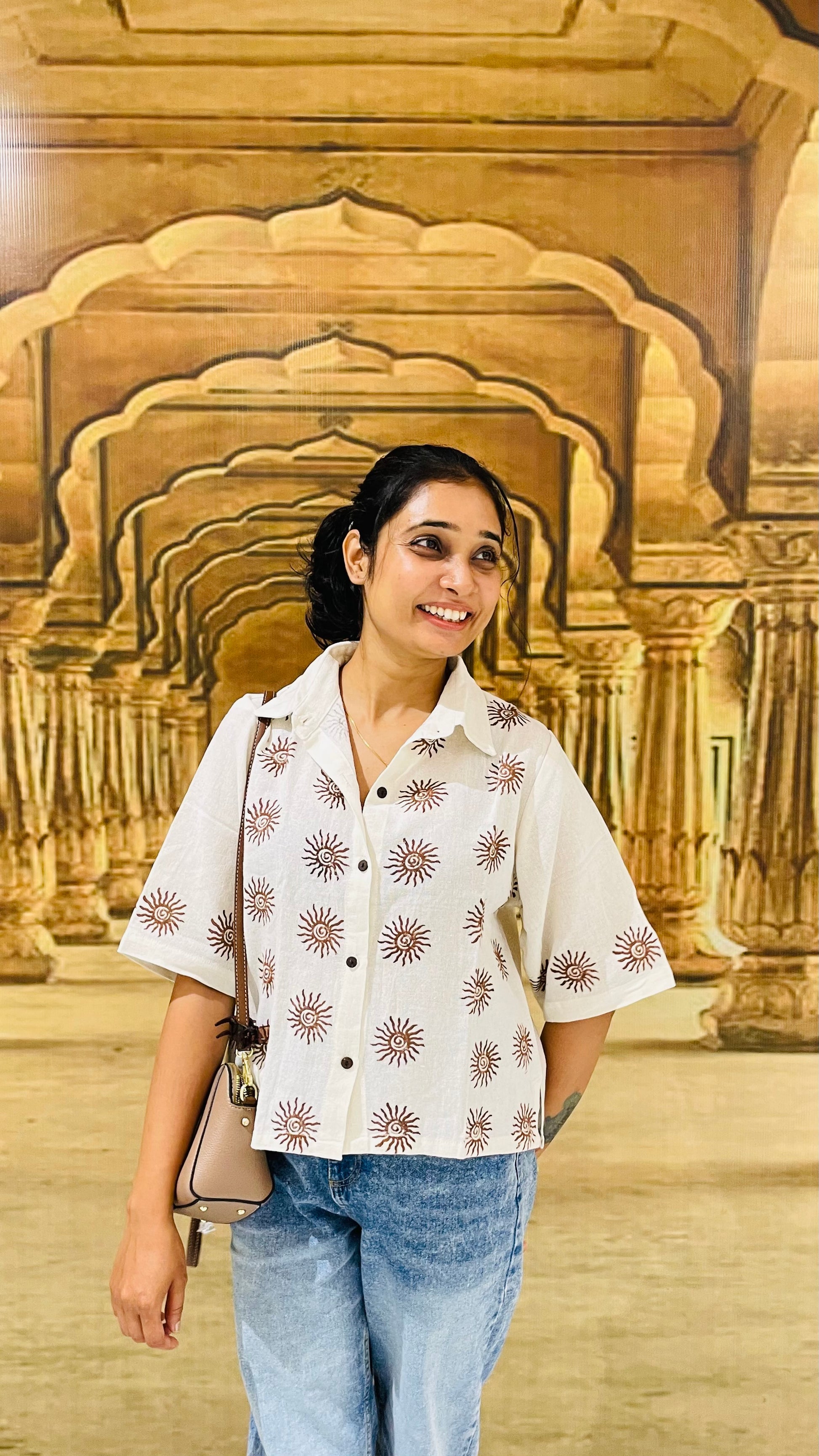 - Features hand-inspired tribal block prints in earthy brown – giving it a rooted yet modern vibe.