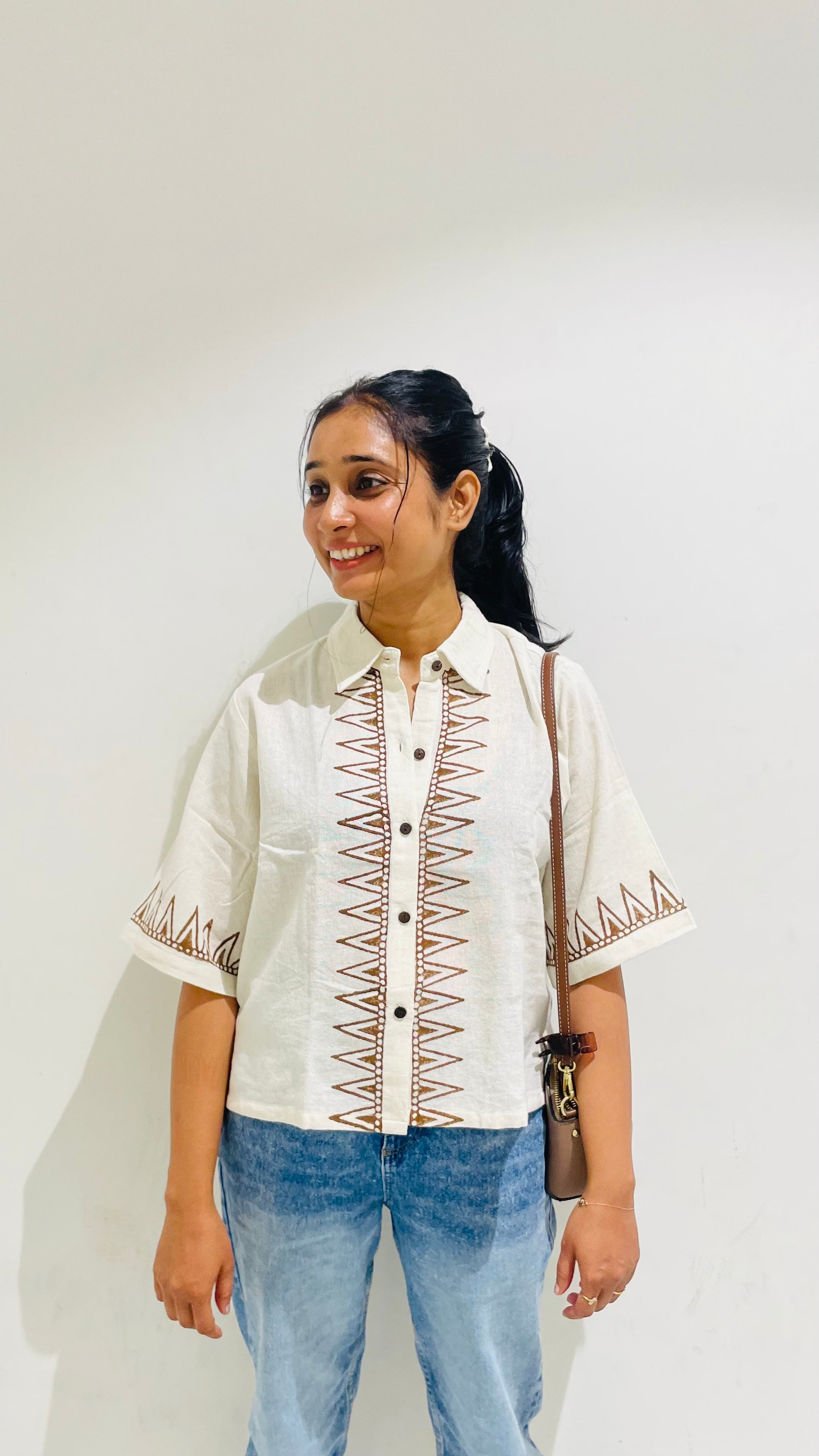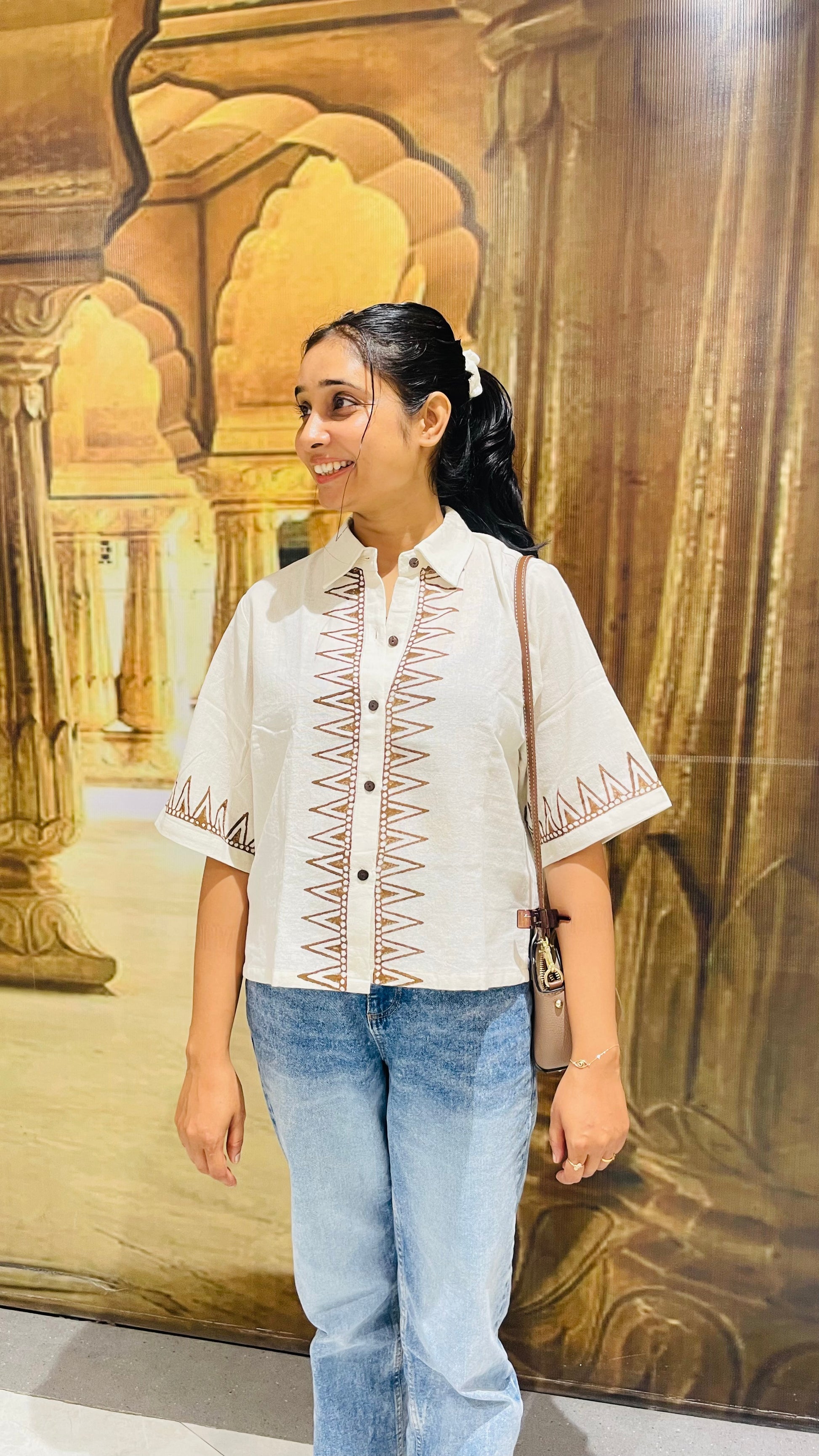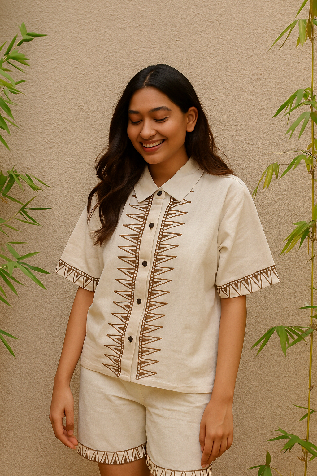 This off-white jute-cotton shirt is all about comfort with a touch of craft. The fabric feels light and breathable, perfect for long hours of wear. The earthy brown zig-zag block prints along the front and sleeves give it a handcrafted, festive charm without being too loud.